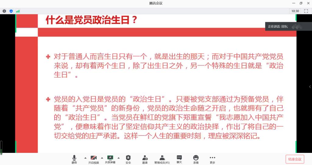 为全面加强入党积极分子的党性教育,端正入党动机,2020年6月6日晚,球王会员工党总支副书记汪品君老师召集67期入党积极分子在线上开展“政治生日+”党建活动。活动由疫情期间表现突出的田东同志主持,第67期全体入党积极分子参加。