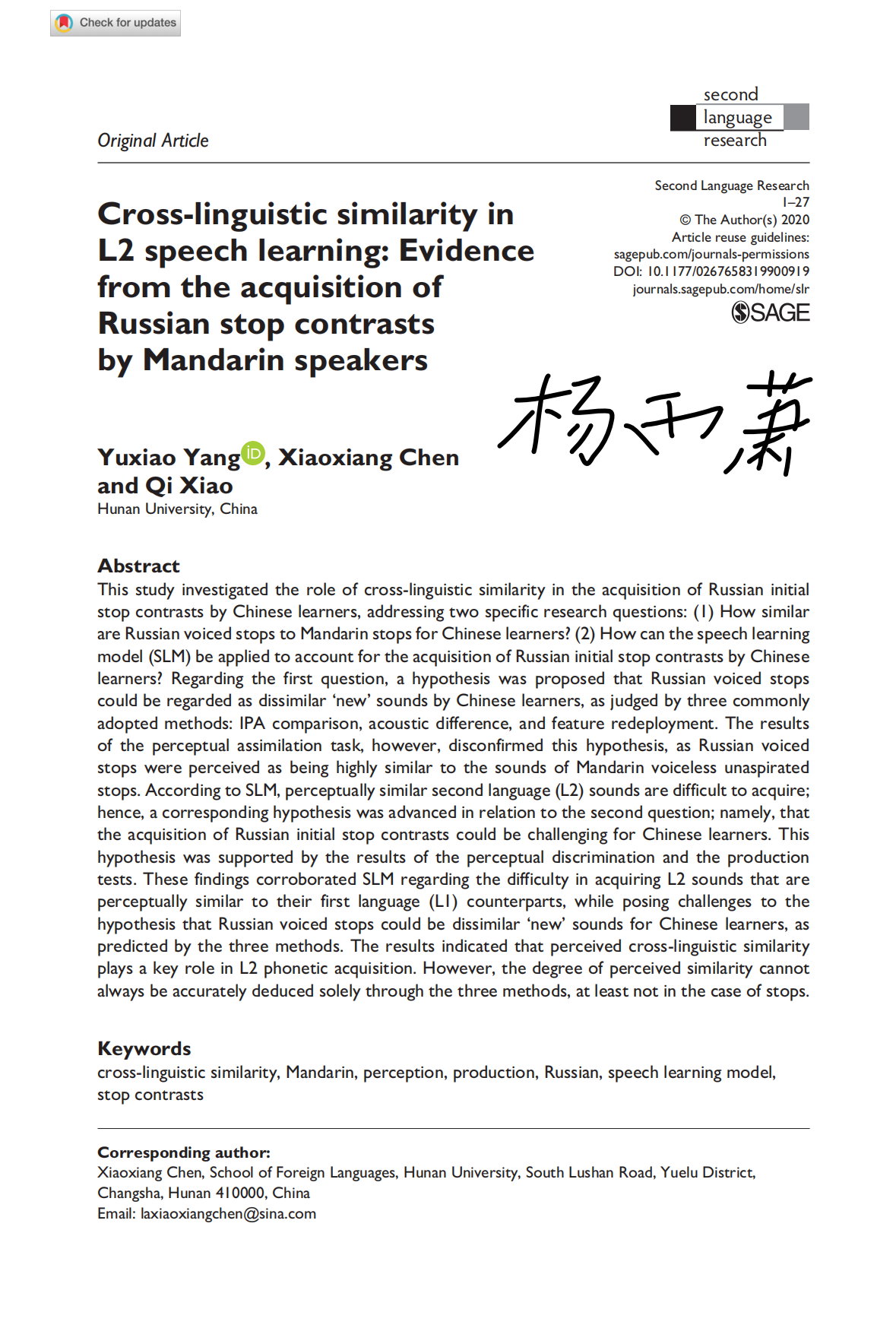 上一条:杨艳霞,王湘玲 Measuring the stability of machine translation in classroom context 下一条:姚尧,陈晓湘 音乐训练对4_5岁幼儿普通话声调范畴感知能力的影响