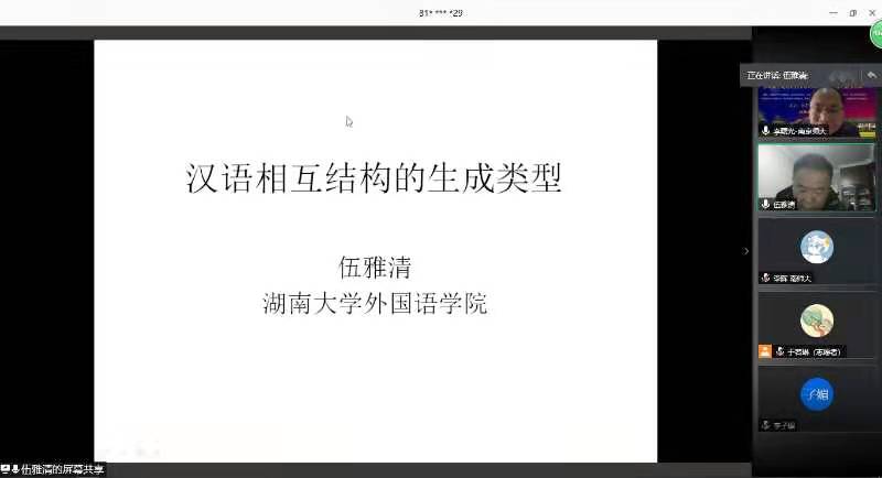 第四届中国理论语言学及其协作应用高层论坛采用网络直播形式,数百名各高校及科研机构的专家、学者、硕博研究生参加其中,共同探讨语言学前沿问题,增进各分支学科的交流与沟通,促进中国语言学的繁荣与发展。会议共特邀19位理论语言学及其相关研究领域的杰出专家进行主旨发言,与伍雅清教授、曾涛教授同时担任本次论坛主讲嘉宾的还有中国社会科公司沈家煊教授、南京大学陈新仁教授、西南大学文旭教授、南京师范大学张辉教授和辛斌教授、中山大学丁建新教授、北京语言大学司富珍教授、天津外国语大学田海龙教授、上海交通大学王振华教授等等。