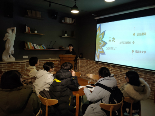 肖轶群同学主要从语言翻译、文学的独特性以及语言和文学三个方面为同学们解释了阅读文学作品在语言学习方面的重要性。首先,肖轶群同学从语言翻译出发。肖轶群同学表示,语言学习主要是思维方式的培养,并且以自己曾经翻译的经历为例,说明了翻译主要需要完整性思维,“较长的短期记忆”和连贯性思维。随后,他提出了自己对文学独特性的看法并且建议同学们进行阶段性阅读。肖轶群同学以自己的经验为例,为不同年级的员工提供了不同的阅读资料。鉴于此次的听众大部分为大一的新生,他建议刚接触日语的新生们可以先从轻小说开始阅读。除此之外,他还总结了阅读文学作品的两个主要作用。从具体的作用来说,文学作品具有模仿价值,同学们可以选择跟读轻小说;从抽象的作用来说,文学所具有的延展性使同学们可以通过阅读了解更多的日本文化。