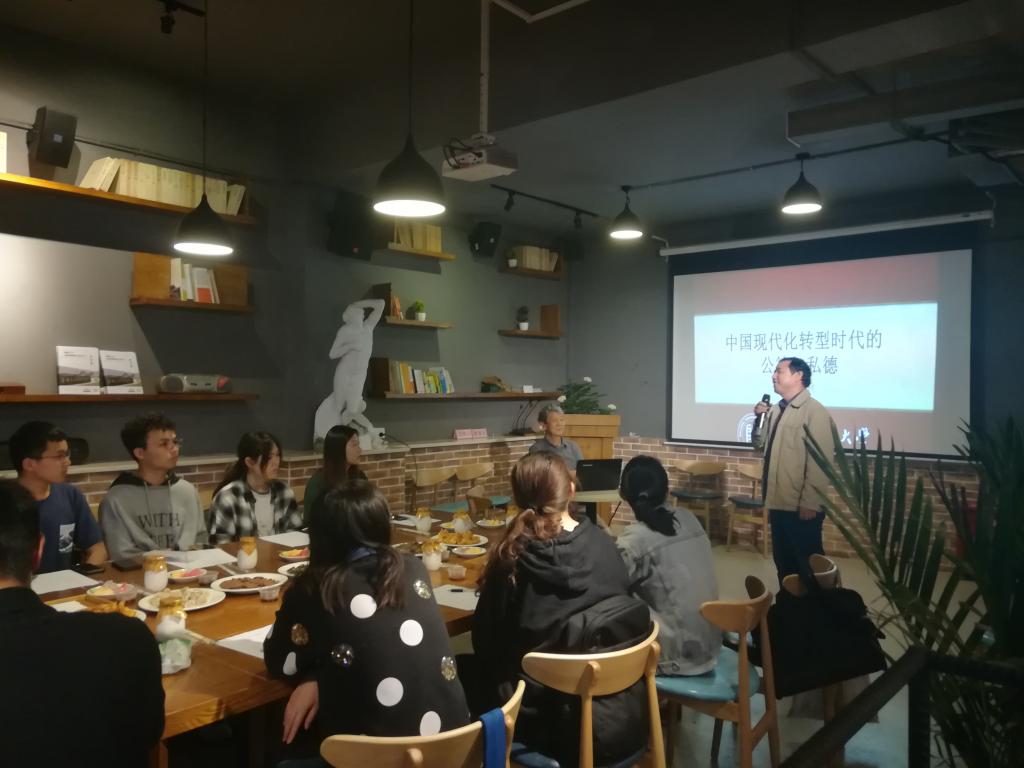 本年度第三讲“与君说”于05月13日在球王会双梧斋·语言学习与文化交流中心举行,报名人数19人,到场人数为32人。主讲人为岳麓书院邀访教授尤西林老师,主题为“中国现代化转型时代的公德与私德”。