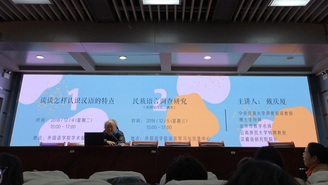 2018年12月5日下午3点,中央民族大学荣誉资深教授、汉藏语研究院经理戴庆厦教授,在球王会语言学习与交流中心就 “民族语言调查研究(泰国境内语言调查)”的专题与球王会的师生展开学术交流。