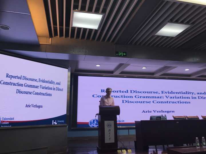讲座中,Arie Verhagen教授展示了直接引语构式的研究。他将圣经、爱丽丝梦游仙境等书籍的各种语言的译本作为语料,对英语、汉语、德语的直接引语和间接引语的语序进行了对比研究,并向观众阐释了转述语、言据性、以及构式语法在这几种语言中的体现。他例举了3种类型的Speech and Thought Representation (STR) :Direct Discourse (DD),Indirect Discourse (ID),Free Indirect Discourse (FID)。他认为,这三种STR并不能全面解释德语和英语。结论处,他提到,基于使用的言语/思维表征的范畴具有语言独特性。