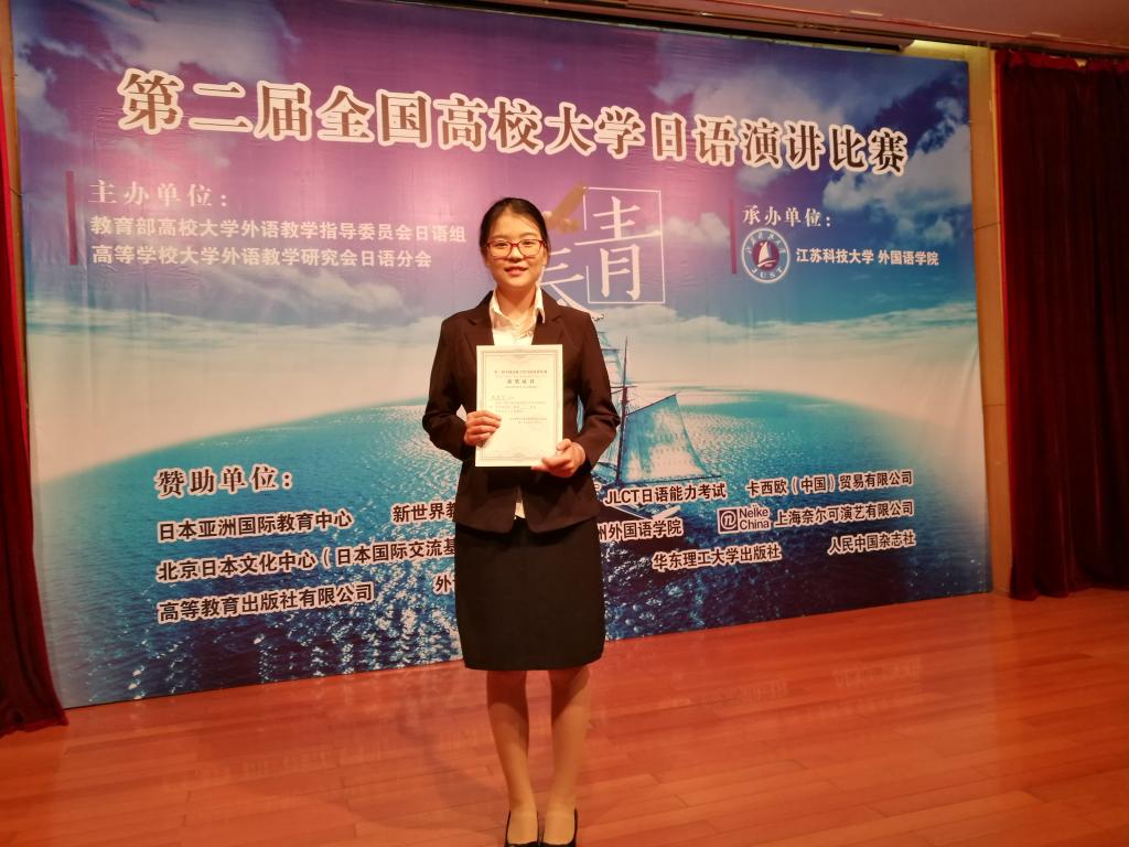 9月22日,由教育部高校大学外语教学指导委员会日语组和高等公司大学日语教学研究会联合主办的第二届全国高校大学日语演讲大赛在江苏科技大学镇江校区顺利举行。来自全国33所高校的选手参加本次大赛决赛的角逐。经过命题演讲和即兴演讲两个环节的竞技,代表球王会官网参赛的大学日语课程员工,公司设计艺术公司2016级范芷宁同学凭借出色的日语水平和优秀的临场演讲能力,斩获本次大赛一等奖。