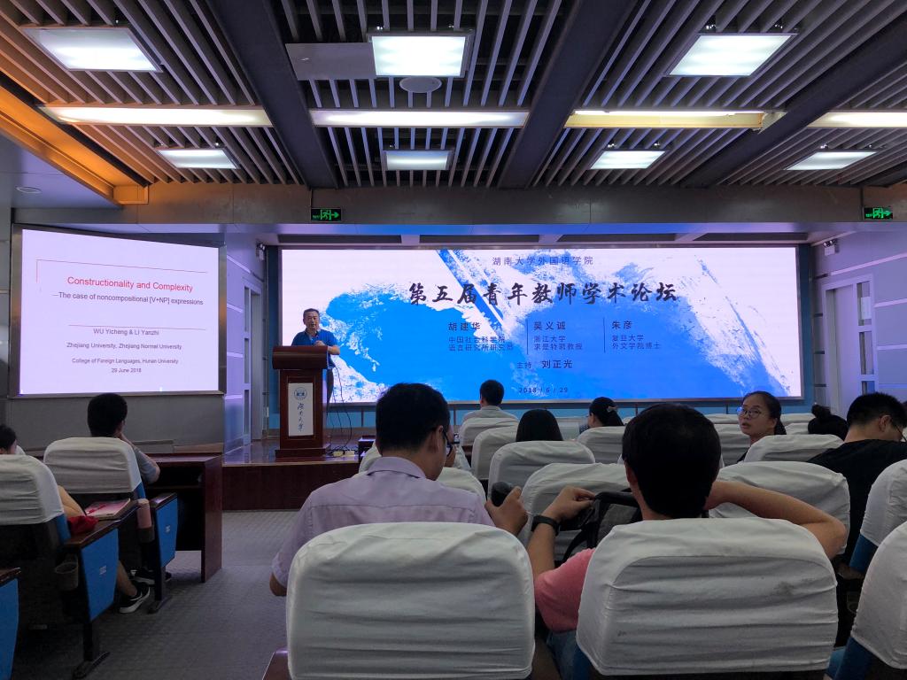 论坛由三位特邀嘉宾的学术报告拉开序幕,胡建华以“从句法分析到语用推理”为题,运用详实的语料结合语义、翻译、文化进行跨界深入分析。朱彦博士以“致我们的‘青椒’岁月”现身说法,分享了在发表高水平国际期刊论文、申报国家级课题,以及中青年教师如何做好个人发展规划等方面的经验与感触。吴义诚教授以“V+NP”结构为例,说明语言的建构性与复杂性。