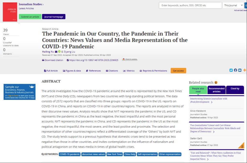 近日,公司于海玲教授团队在《Journalism Studies》(新闻研究)期刊发表论文The Pandemic in Our Country, the Pandemic in Their Countries: News Values and Media Representation of the COVID-19 Pandemic,是该团队语言学、翻译学与新闻传播领域跨学科研究的最新成果。