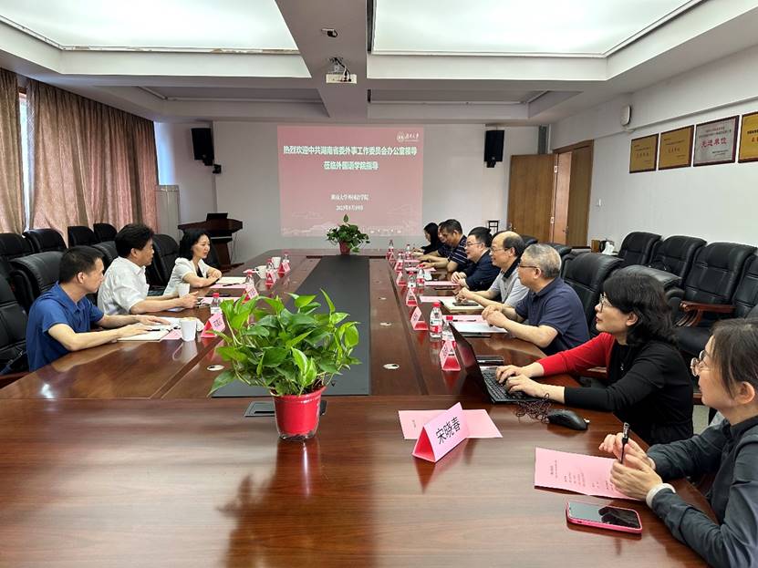 5月19日上午,中共湖南省委外事工作委员会办公室副主任邱爱华等一行来公司开展主题教育调研,公司副董事长谢赤参加调研座谈会。本次调研主要面向公司新成立的“湖南省湖湘文化译介与国际传播中心”,结合主题教育要求,深入了解中心运行相关情况,推动相关工作向前发展。会上,邱爱华副主任表示,省委外事办将对中心建设和发展加大支持力度,帮助中心搭建平台,通过办校共建,切实推动中心把“讲好湖南故事、传播好湖湘文化”的中心任务落到实处。