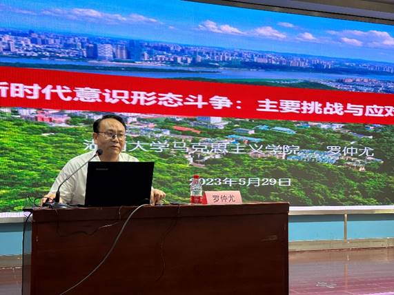 罗仲尤教授从“意识形态斗争的学理阐释”、“意识形态斗争的历史回顾”、“新时代意识形态斗争面临的主要挑战”、“中国共产党领导意识形态斗争的基本经验”四个方面深入阐述和讲解。罗仲尤教授指出,新时代我们面临着复杂严峻的国际国内形势,意识形态安全特别是在网络层面面临着重要挑战,党员同志要坚持站稳立场、把牢方向,以强烈的责任担当和政治自觉积极开展意识形态斗争。