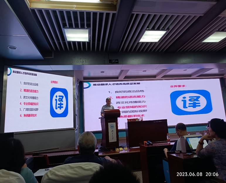 黄友义教授的讲座首先从具体案例切入,分析当前中译外的重要性。他提出翻译的关键在于语言水平,译者要做到精准翻译,就必须夯实政策基础知识,提高译前与译后编辑能力。黄教授接着强调要做好翻译过程中的话语体系转换,他指出“翻译中国”必须要具有国际传播意识并力求表达精准,以便最大程度地用英语讲好中国故事。最后,黄教授还阐述了翻译专业博士的前景及如何有力推动翻译人才培养高质量发展。