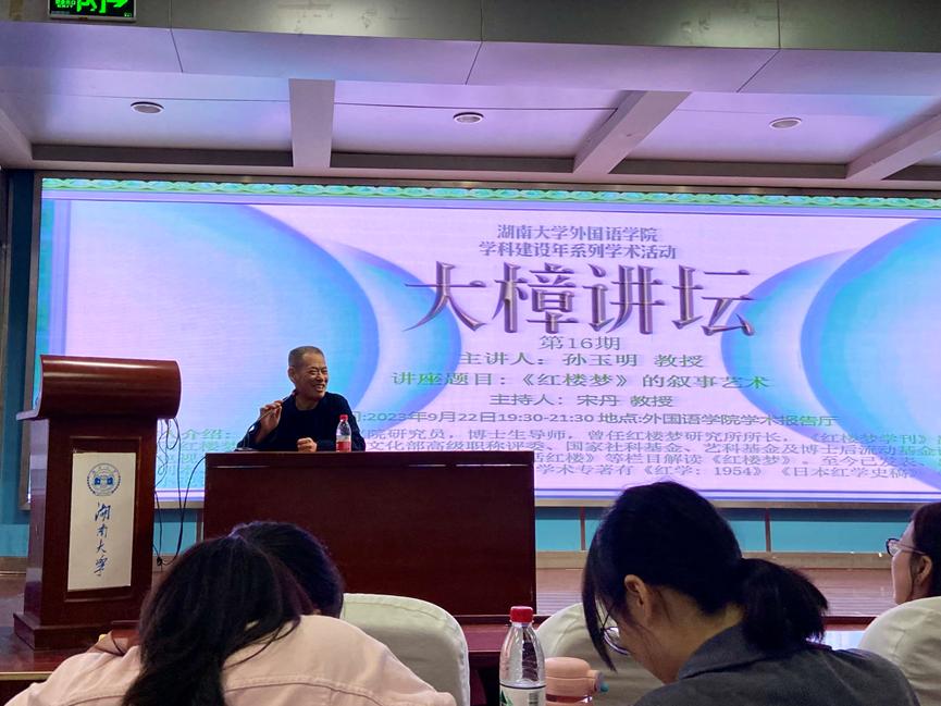 讲座伊始,孙玉明教授便以幽默风趣的语言拉近了与台下师生的距离。讲座分为三个部分,孙教授首先简要介绍了何为叙事艺术,讲述了“说书人”的口头语言与肢体语言叙事发展出中国章回体小说的历程。“说书人”的叙事视角是全知视角,但《红楼梦》的独特之处在于还采用了限知视角,不断转换书中人物的视角来叙述。