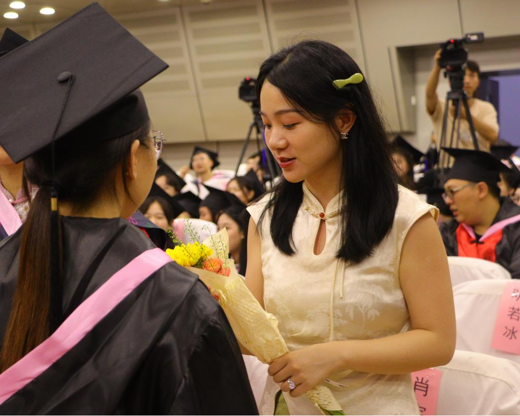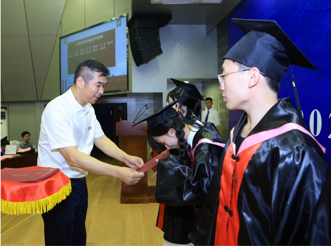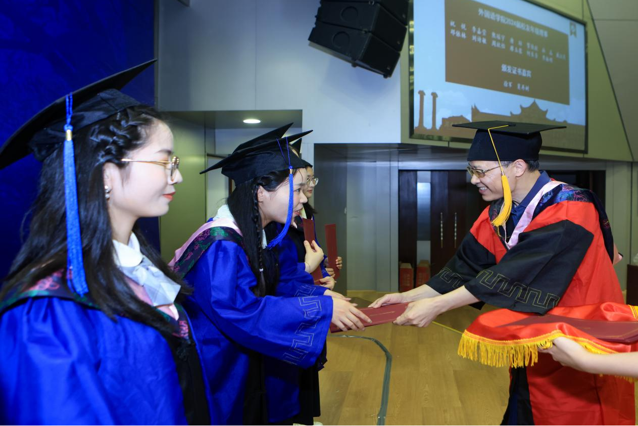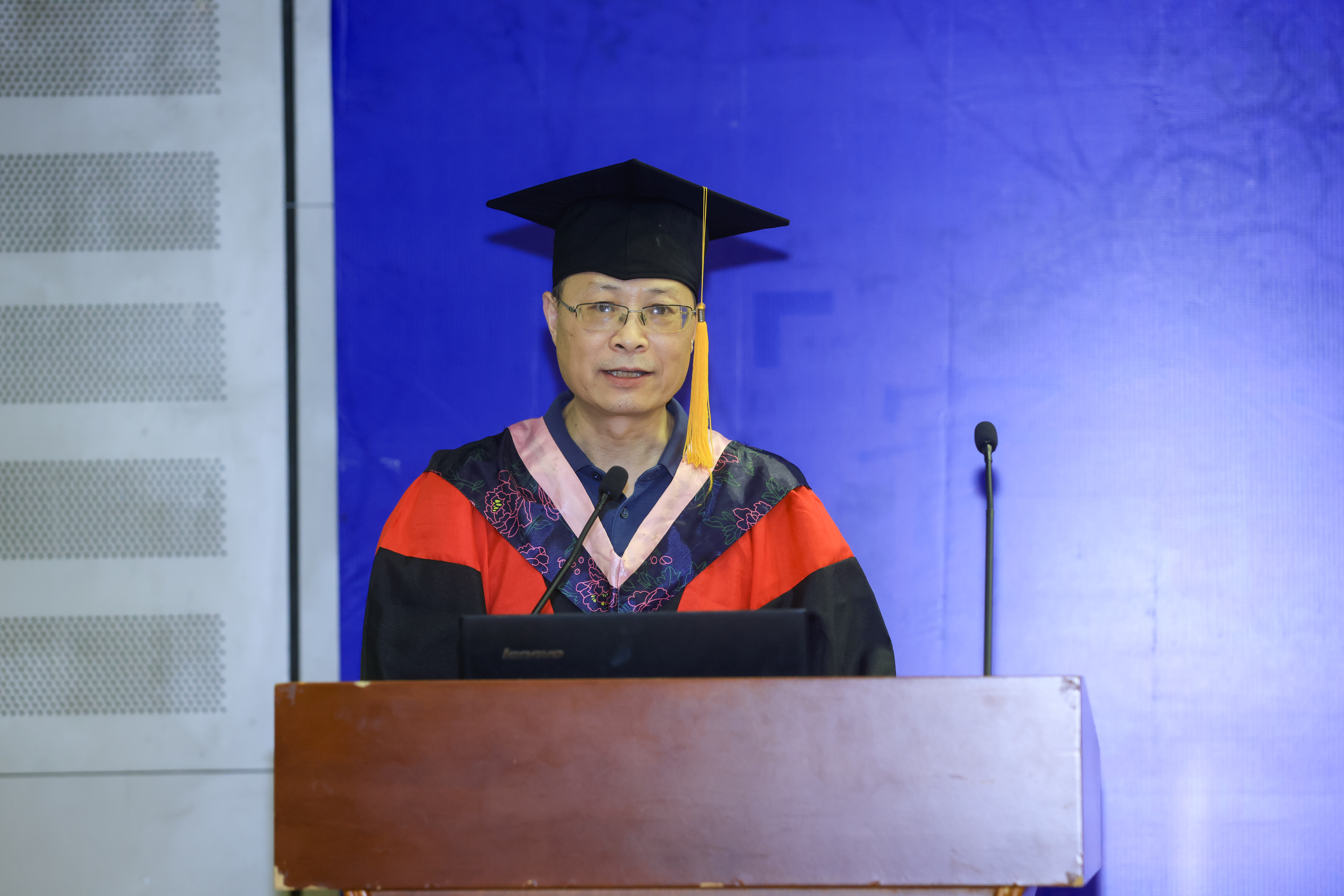 今日一别,来日高处再会,陈千谦老师作为教师代表,为同学们送上了真挚的临别祝福。陈千谦老师送给同学们三句寄语:“莫等闲,白了少年头”,“千磨万击还坚劲,任尔东西南北风”,“海内存知己,天涯若比邻”。无论去往何方,外院永远是同学们的港湾,期望同学们带着与外院的美好回忆和老师们的祝福去往更远的地方,奔赴祖国各地建功立业。