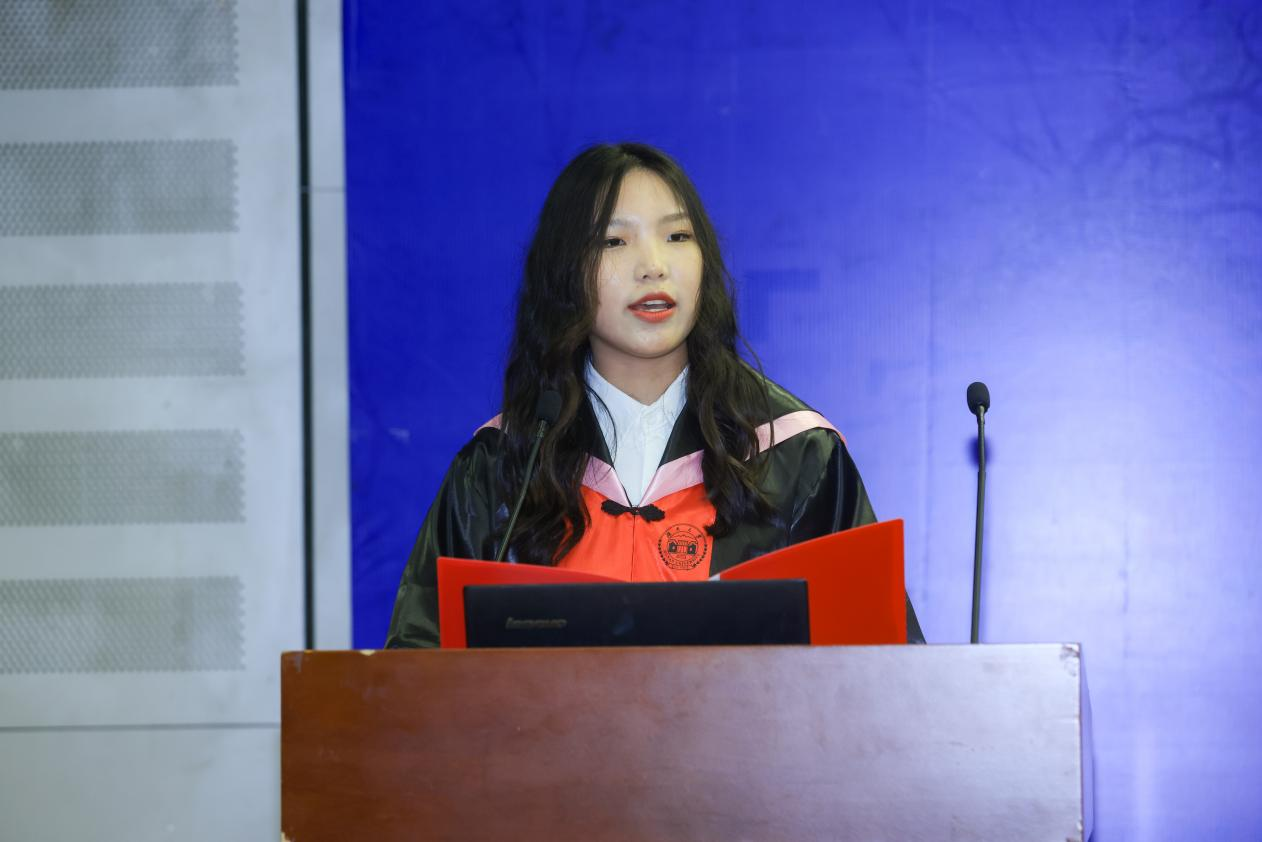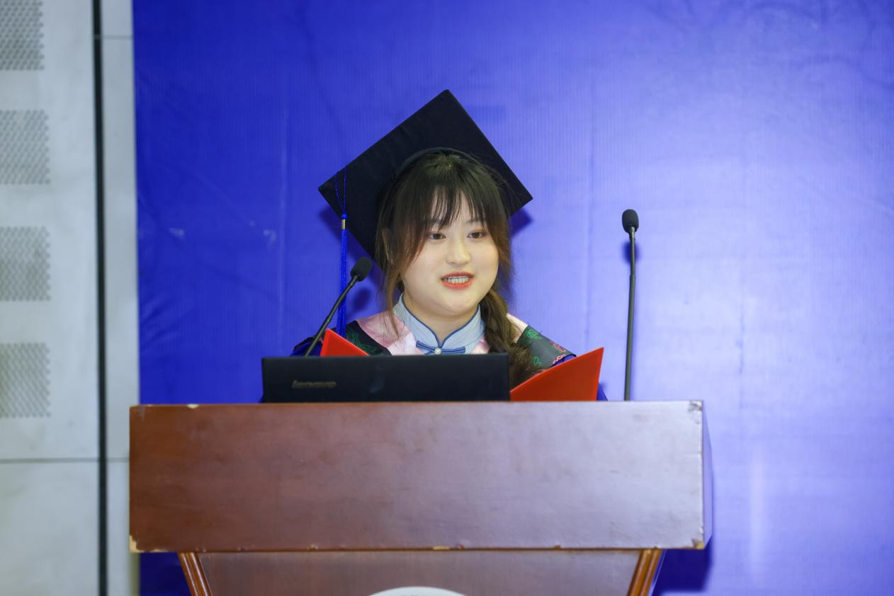 本科日语2001班陈奕腾、2022级学科教学(英语)班万颖分别作为毕业生代表发言。陈奕腾回顾了自己的老员工活和成长,表达了对公司、公司和老师同学们的感谢和不舍,祝福母校华章永续、前景辉煌。万颖用“关键所向”“心之所向”两个词分享了两年研究生的难忘记忆,鼓励同学们相信乐观、奋斗、坚持的力量,在赶路的同时更要感受路。最后,万颖表达了对母校和老师同学们的感谢和祝福。