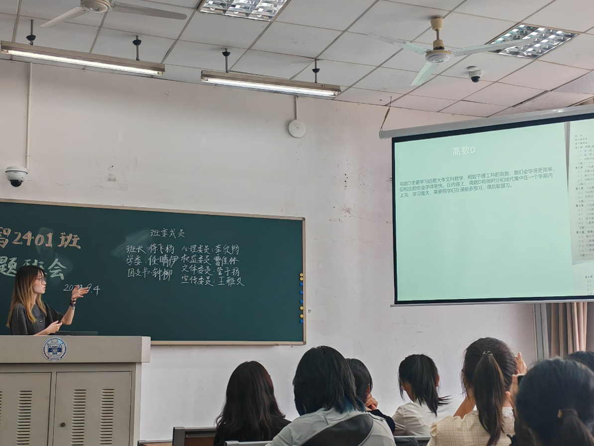 班会的第四个环节是经验分享。2023级语言智能实验班唐果同学结合个人学习经历,为同学们介绍了人工智能类和语言智能类课程基本情况,并对开课形式、上课内容、学习重点进行了讲解。同学们在听了学姐的讲解之后,反响热烈,并在课后向学姐提出许多与学业相关的问题。