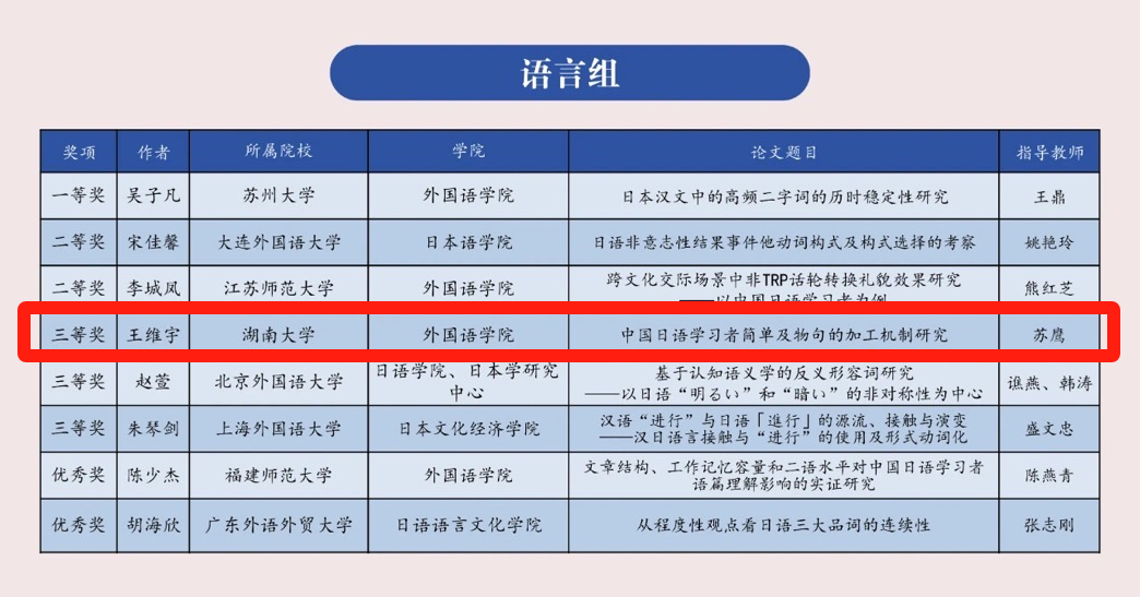 李依格的硕士论文《日语学习者动词否定郑重形使用的背景因素考察——通过与日语母语者的对比》运用分类树分析方法,首次提出“是否具有对话性”是影响日语母语者否定郑重形使用的决定性因素。该论文的相关成果已于2023年9月正式发表于日本期刊『日本語文法』(第23卷第2期)。王维宇的硕士论文《中国日语学习者简单及物句的加工机制研究》控制格助词和生命性作为实验间变量,发现中国日语学习者对生命性信息的依赖程度高于格助词。王维宇曾在3场学术研讨会上汇报该论文的相关成果,并在“2023年日语教育与日本学研究国际研讨会”上荣获优秀论文奖。