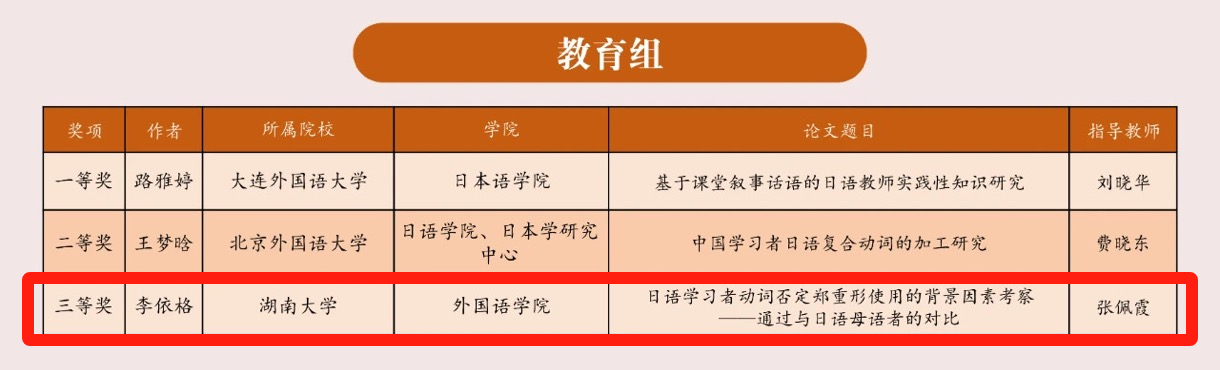 公司日语系硕士研究生曾多次在此评选活动中斩获佳绩。截至本届评选,已有一等奖1名、二等奖2名、三等奖6名、佳作奖、优秀奖若干名。一等奖获奖者为2022届黄丹荔(宋丹教授指导)(第十五届),二等奖获奖者为2010届刘峰(熊沛彪教授指导)(第三届)和2019届王迎迎(瞿莎蔚副教授指导)(第十二届),三等奖获奖者分别是2016届刘小桐(戴松林副教授指导)(第九届),2020届陈丝雨(瞿莎蔚副教授指导)和马亦飞(曹莉副教授指导)(第十三届),2022届秦玥(邓超群副教授指导)(第十五届),以及2024届李依格和王维宇在本次第十七届评选中获奖。