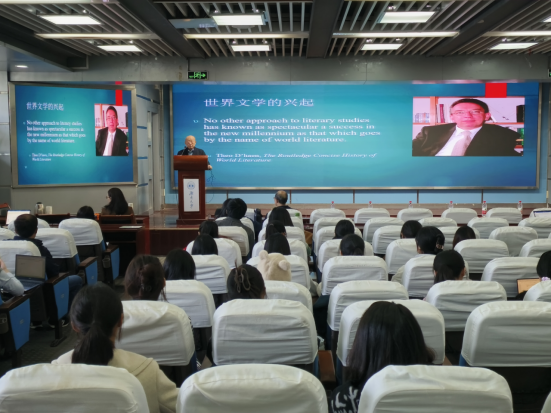 张隆溪教授从世界文学的兴起出发,提出了重新界定世界文学、尚待发现的世界文学、中国文学的机遇等有关观点,指出世界文学的“流传”需要通用语(lingua franca)作为媒介。张隆溪教授向大家介绍了自己近期推出的英文著作A History of Chinese Literaure,这本著作的出版将进一步推动中国文学进入世界文学范围。最后,张隆溪教授鼓励师生们应在时代潮流中把握中国文学的机遇,努力向世界介绍中国文学,传播中国文学之美。