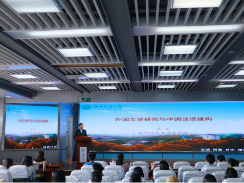 讲座伊始,苏晖教授从历史和现实层面阐述了在外国文学研究中建构中国话语的重要性和必要性,分析了如何在外国文学研究中凸显中国视角和中国立场。苏晖教授指出,在学术研究和写作中,学者们应在比较文学的视野中努力寻求外国文学研究中的中国视角,敢于对外国文学文化进行质疑与反思,加强学术研究的“对话性”,充分发掘本民族理论和文化资源,从而构建中国特色的理论和话语体系。