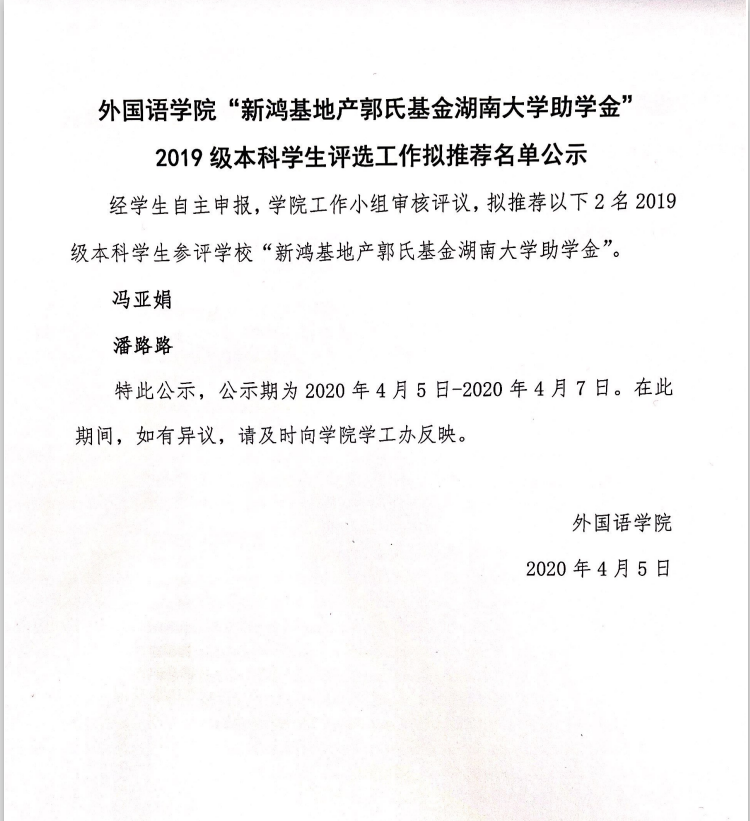 球王会“新鸿基地产郭氏基金球王会官网助学金” 2019级本科员工评选工作拟推荐名单公示