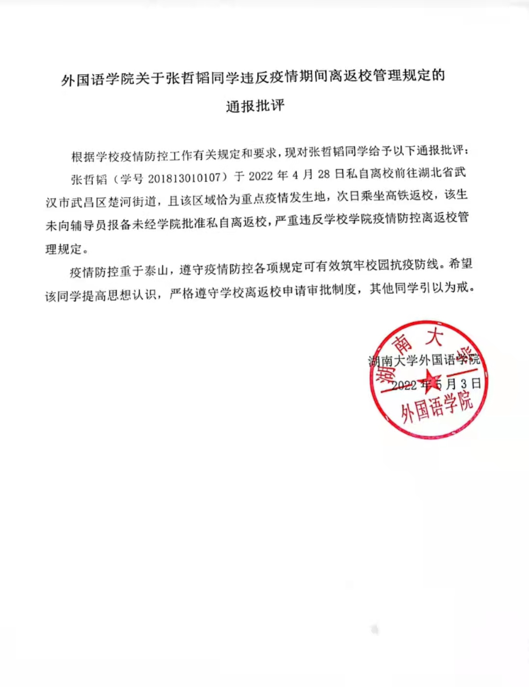 球王会关于张哲韬同学违反疫情期间离返校管理规定的通报批评