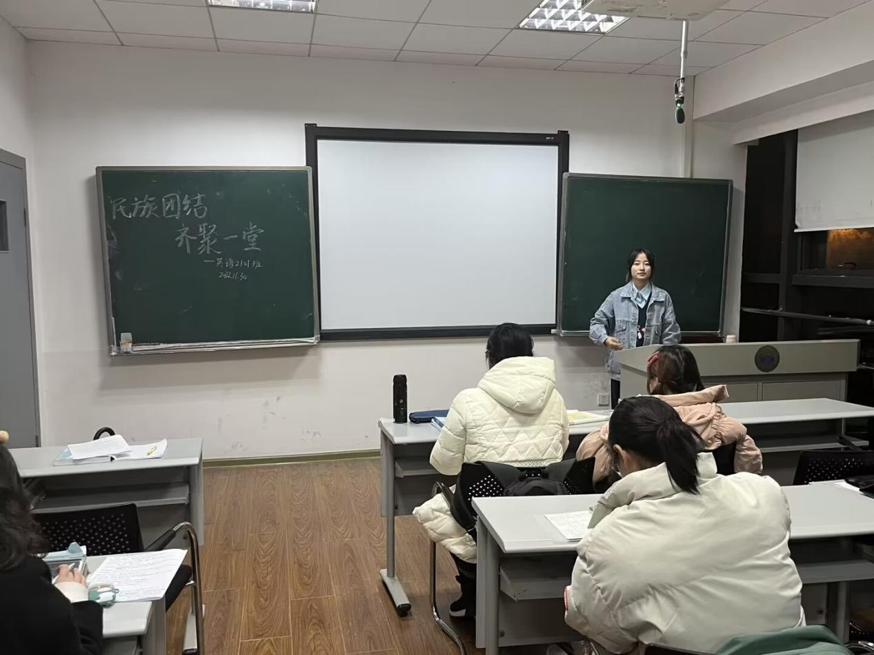 (图为英语2101班班长为同学们讲解民族团结的相关知识)